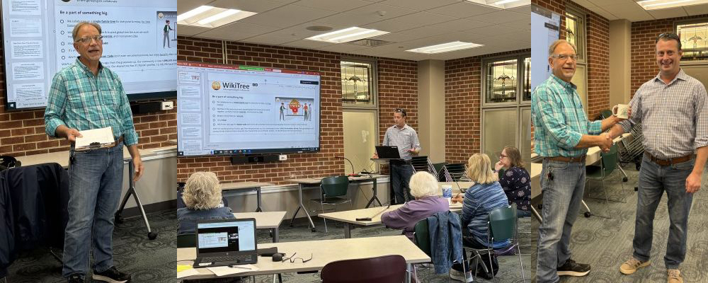 April 20, 2024: President Paul Gregory kicked off the meeting with an announcement of upcoming meetings. He then introduced out guest speaker, Lukas Murphy. No stranger to Georgetown and Scott County history and genealogy, Murphy presented an interesting session on WikiTree, a website that allows users to research their family trees using reliable sources to document findings. Lukas has been an ardent user of WikiTree, and stressed many of its functions that should appeal to genealogists; WikiTree is free to use, so you can't beat the price; the WikiTree platform insists on source verification; WikiTree stresses the privacy of the data. The WikiTree community boasts a membership of over 1.2 million users. More information is available on the WikiTree website At the conclusion of the meeting, Paul presented the coveted SCGS coffee mug to Lukas.