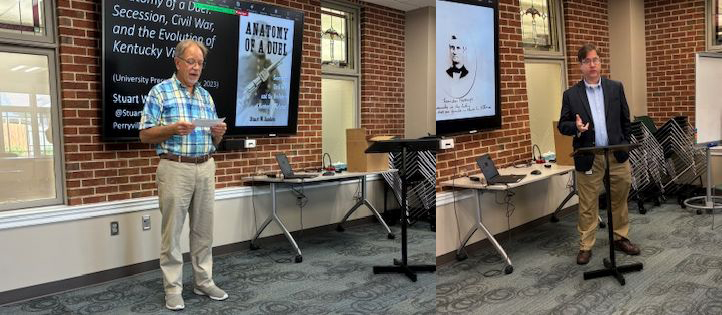 May 18, 2024: We had a great visit from author and KHS Research Director Stuart Sanders who gave an informative talk about a duel fought on the banks of the Ohio River in northern Kentucky during the early stages of the Civil War. He discussed the lives of the duelists and the rise of the practice of dueling. Closer to home in Scott County, there was a known dueling ground on the Scott-Fayette County line located on the outer edge of what is now the Kentucky Horse Park. According to the Georgetown/Scott County Tourism Commission website, "the final recorded duel at the site would not occur until 1866 between a former Union soldier, Alexander Kimbrough, and a former Confederate soldier, Jo Desha. Desha would walk away unharmed, but Kimbrough left with a pistol ball in his hip."