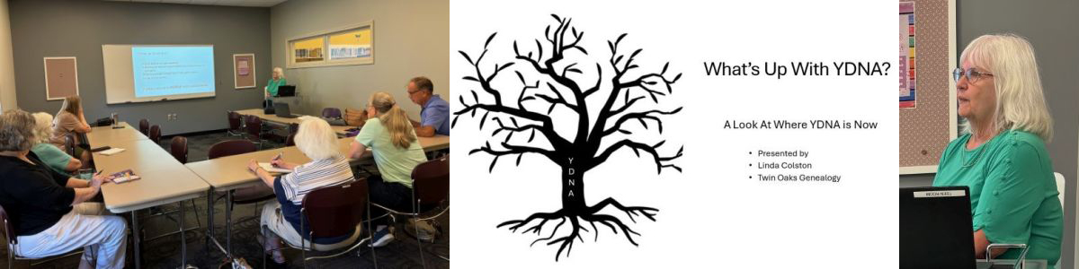 July 20, 2024: Linda Colston, a member of the Association of Professional Genealogists and a long-time family historian, presented an interesting talk on Y-DNA titled, "What's Up With Y-DNA?" In the world of DNA testing, although Y-DNA testing has been available for a long time, significant advances continue to keep us on our toes. In her presentation, Linda walked us through the changes in the types of Y-DNA testing over the years and what the trend is currently. She discussed the importance of haplogroups and how surname projects can aid in our research in discovering our male lines. This was an informative and eye-opening program, and we appreciate Linda's return visit to the SCGS podium.